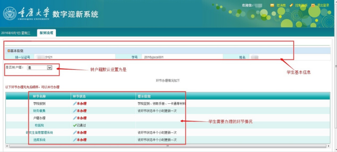 研究生新生根据自身情况,选择是否需要转移户口,完成选择后,下方该环节办理情况会进行同步更新。如下图: