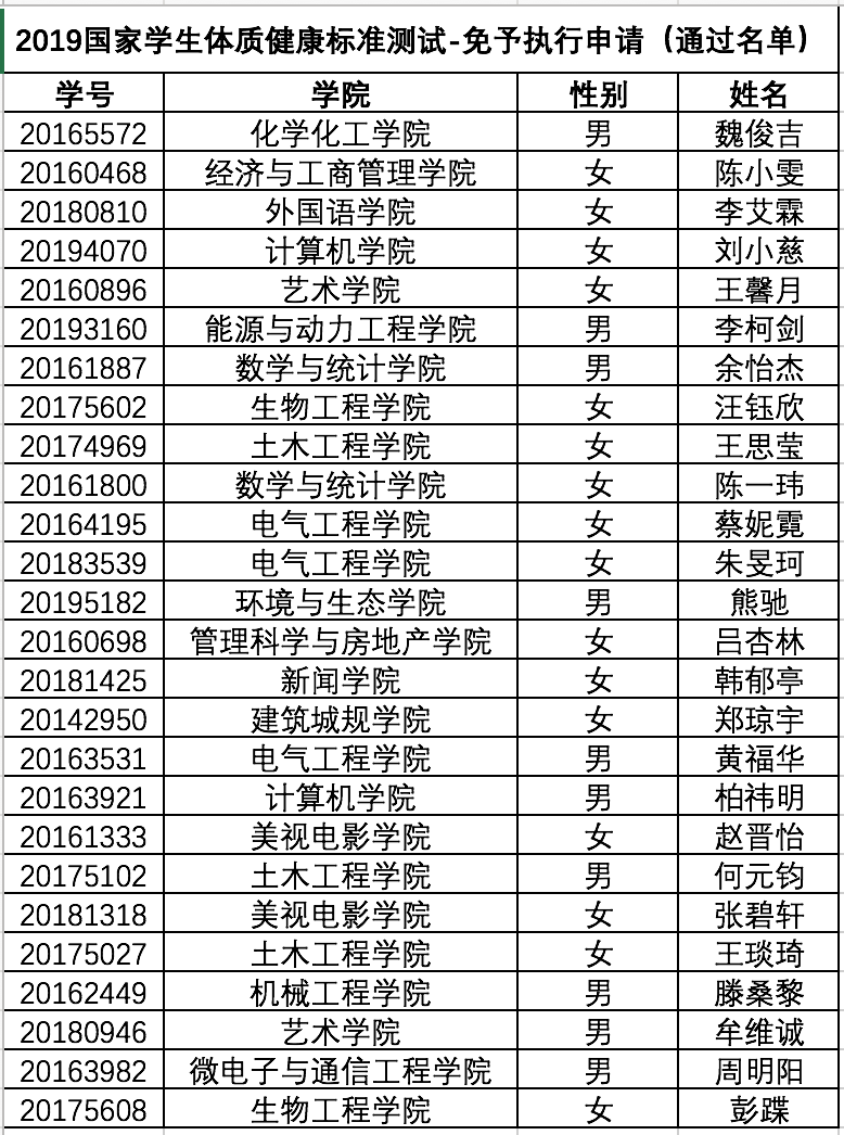 国家学生体质健康标准测试免予执行表的学生,进行了复核工作,以下学生符合免测条件,本科在读期间可免于执行《标准》。