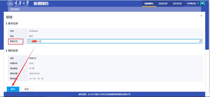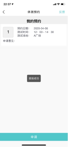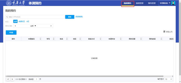 5.进入体测预约,进入我的预约,点击申请,填写联系方式,选择校区以及预约时间,注意此处只能选择下周的时间,如图所示: