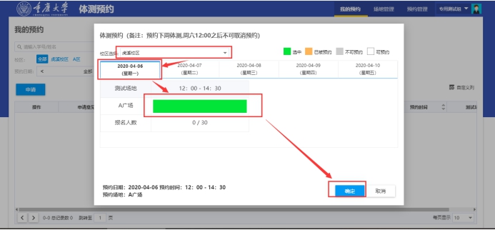 (2)点击申请,选择校区、星期,选中测试场地,点击确定进入下一步,如图所示: