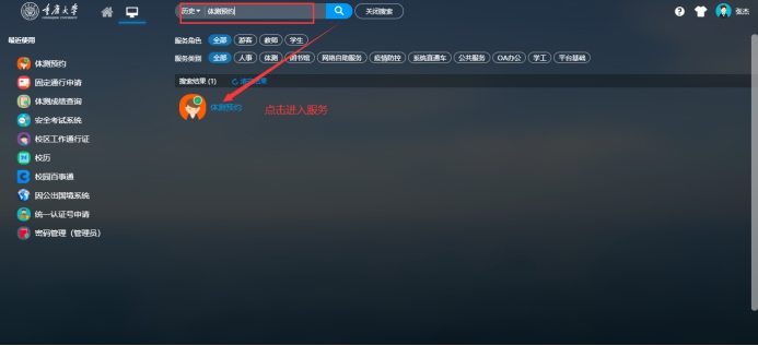 (2)进入网上服务大厅,在顶端搜索框内输入“体测预约”,点击应用进入服务,如图所示: