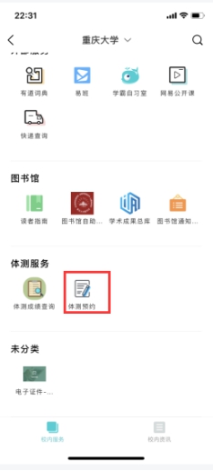 4.同学们选择顶端“我的大学”进入校内板块服务,选择体测服务的“体测预约”服务,然后点击进入,如图所示:
