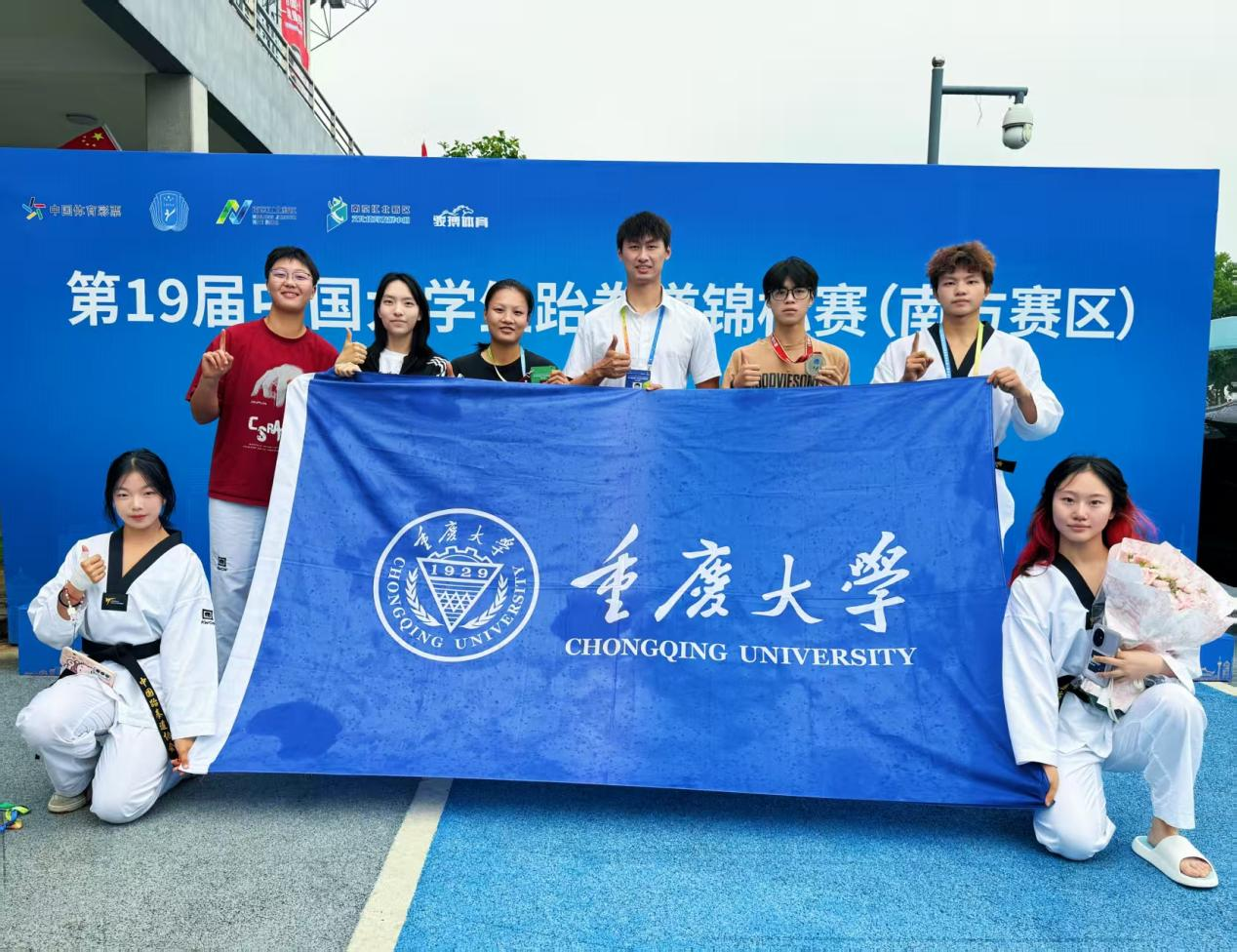 汗水划过护具留下独属于青春的激情之路,聚光灯下,纯白的道服折射出五彩的芳华之光。2025年6月12日第19届中国大学生跆拳道锦标赛(南方赛区)落下帷幕。来自全国高校的1600余名运动员齐聚南京,参赛规模创历史之最。在如此高手云集、盘龙卧虎的处境下,重大的队员们在黄诚胤、任珂教练的带领下凭借着高超的技术、顽强的毅力,在这纷争之地插下了属于重大的战旗,获得了一银一铜的优异成绩。