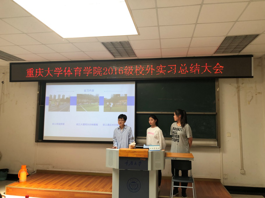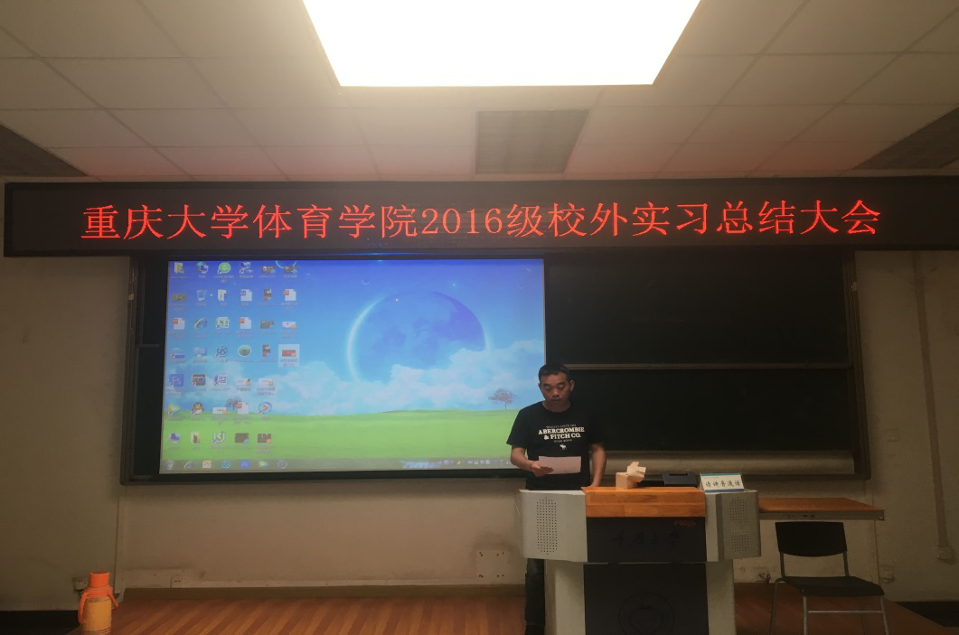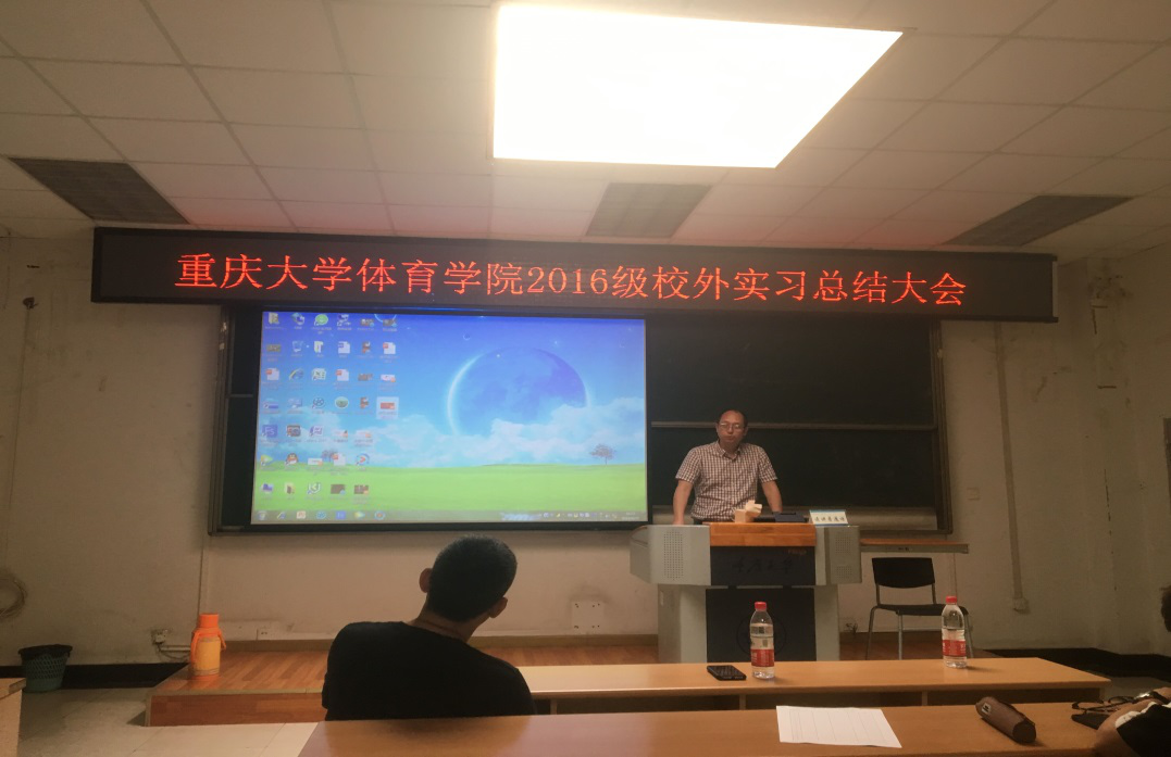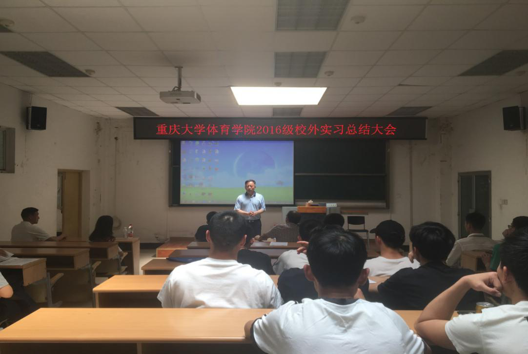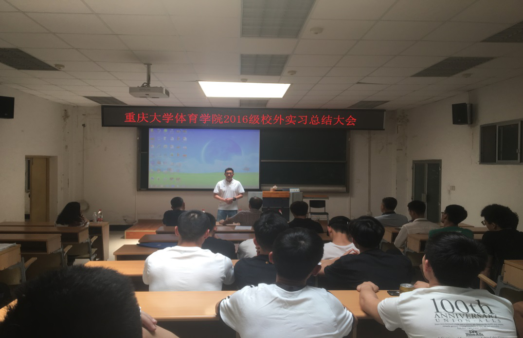 2016级学生校外实习总结大会在学院阶梯教室举行。学院院长许定国、党委副书记李永、副院长落云柯、院团委书记汤婕及2016级本科生参加了本次会议。会议由学院体育教育系主任娄方平主持。