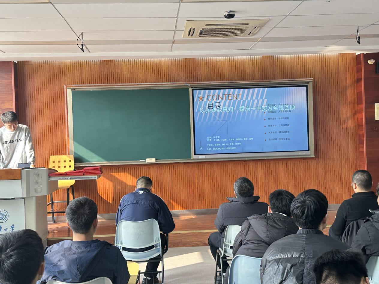 会议伊始,全体师生肃立,注视国旗,齐唱国歌。随后,四个实习小组依次就实习情况作总结汇报,分享实习期间的经历、收获与感悟。同学们结合与学生相处的点滴、指导教师的悉心教导,以及实习过程中的成长故事展开讲述,言语间流露出深深的不舍与感慨。